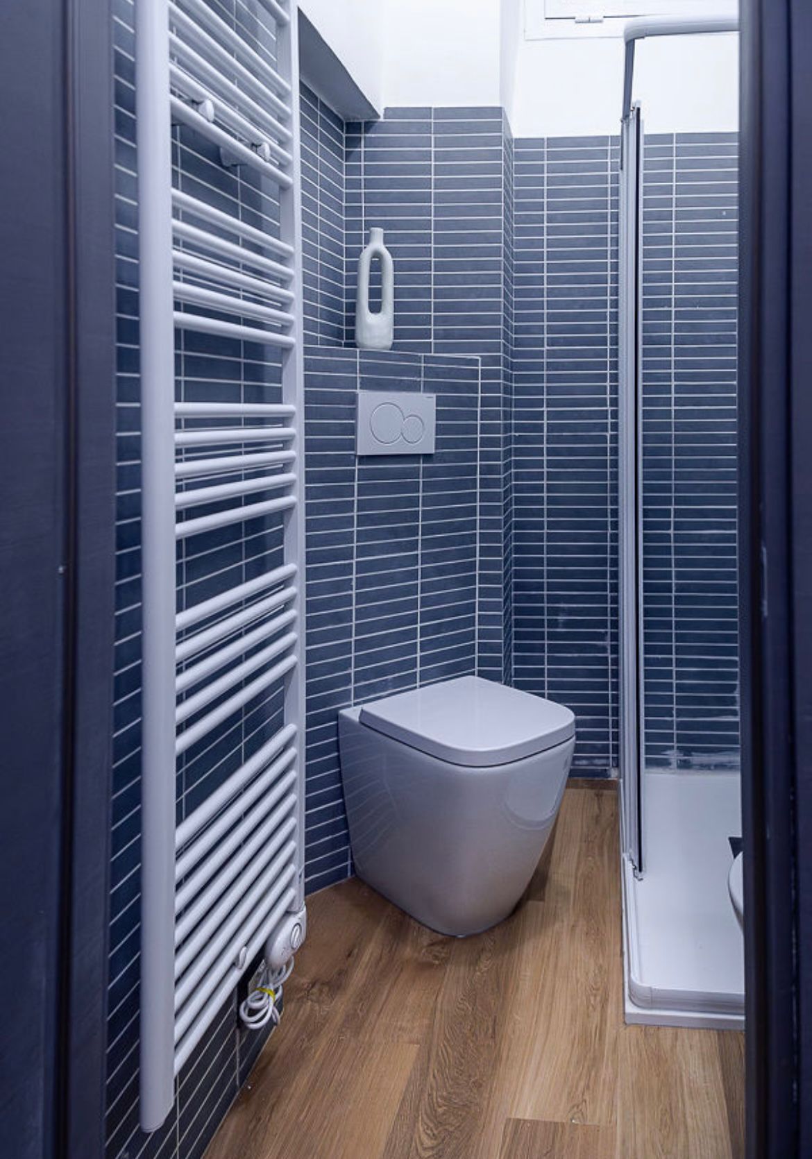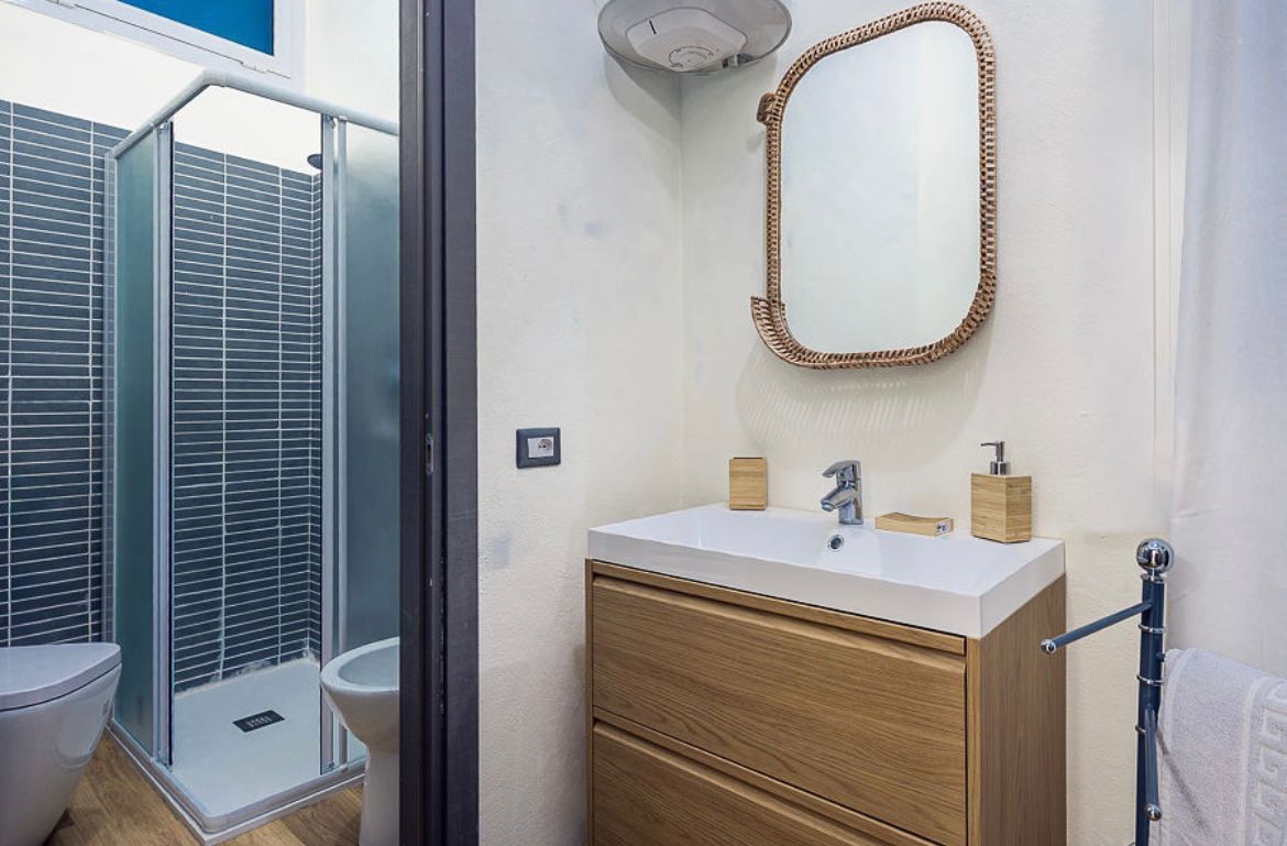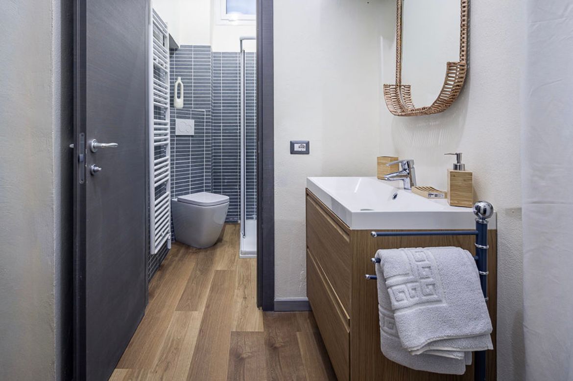 Particolare attenzione è stata dedicata alla zona bagno, completamente riprogettata: è stato reintrodotto l’antibagno per ottimizzare gli spazi e consentire l’inserimento di una doccia, precedentemente assente.